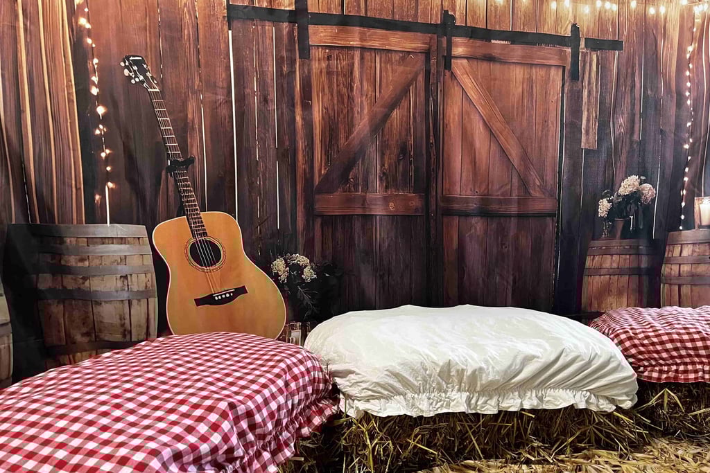 Christophe me parle effectivement de bottes de paille (mais pas que...) Il me parle de course de caisses à savon pour les collaboratrices et les collaborateurs de la RATP, il me parle du salon du mariage pour lequel il fait des animations et de la déco, il me parle de cinéma, de télévision, de la Star Académie et de Légo Master avec Éric Antoine... Très bien. De belles références mais je demande si l’on peut utiliser la botte de paille à l’intérieur ? Du tac au tac, Christophe me réponds qu’elles peuvent être ignifugées, aucun souci, et qu’il est possible de les rendre conformes à toutes les normes de sécurité. Son ton est rassurant, je le crois sur parole.