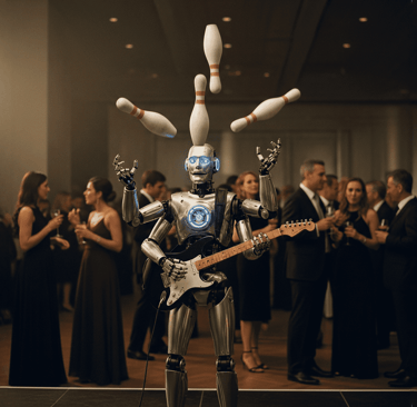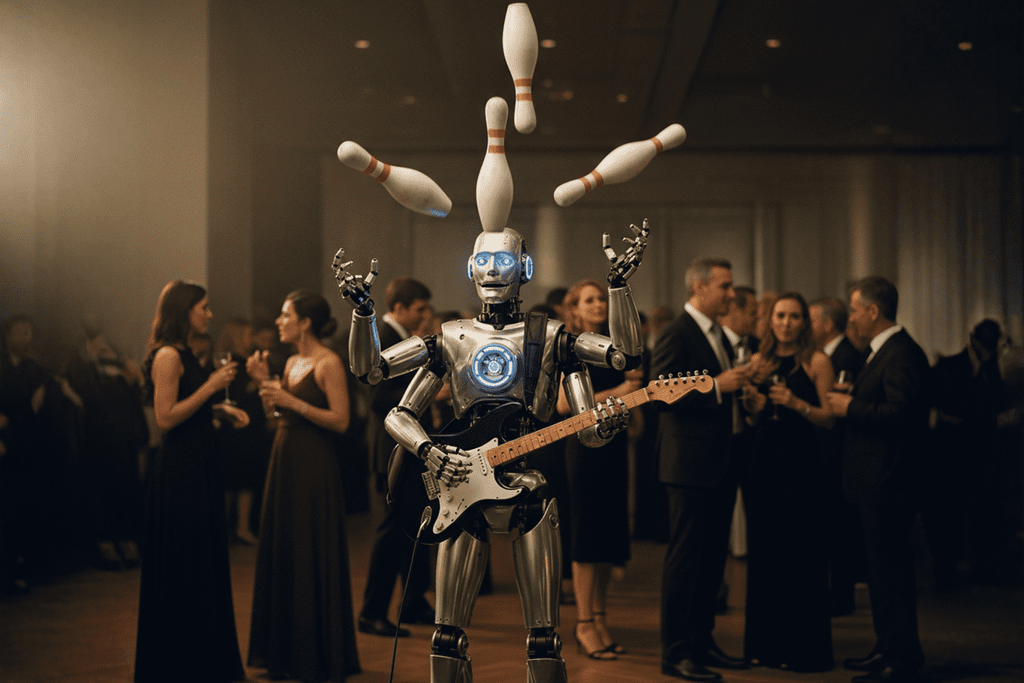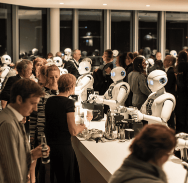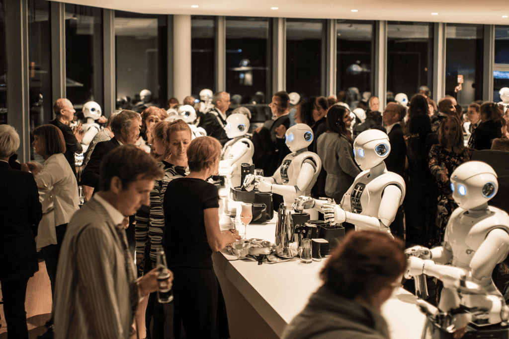 Mais un événement reste-t-il un événement si les machines remplacent les femmes et les hommes ? Un événement garde-t-il la même charge émotionnelle, la même chaleur, si les invités sont accueillis par des machines, de belles machines certes, d’étonnantes machines certes, mais des machines tout de même ? Un événement reste-t-il émotionnellement fort si l’animateur est un acrobate en plastique, si la chanteuse est un robot, si le photographe est un totem sur roulette ?
